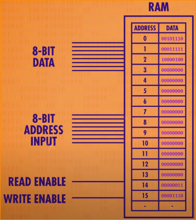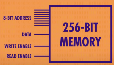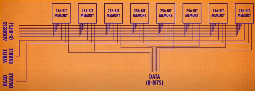 8개를 일렬로 세웠으니, 8비트(1바이트)의 숫자를 저장할 수가 있다. 이렇게 하려면, 8개 모든 256비트 메모리에 정확히 똑같은 주소를 동시에 입력해야 한다. 그리고, 각 메모리에는 숫자의 한 비트씩 저장한다. 따라서 이 부품은 256개의 주소에 256 바이트를 저장할 수 있게 되었다. 이것을 한 번 더 추상화하면 다음과 같이 표현할 수 있다.
