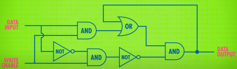 위와 같은 회로를 AND-OR 래치(자물쇠 또는 걸쇠를 뜻한다.)라고 한다. 이 회로는 2개의 입력을 갖고 있다. 출력을 "1"로 만드는 SET입력과 출력을 "0"으로 만드는 RESET입력이다. 이제 한 비트의 정보를 기억하는 메모리가 만들어졌다.