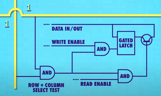 AND 게이트를 사용하여 행과 열이 모두 1이 되어야 1을 출력해서 단 하나의 래치만 선택할 수 있는 신호로 사용할 수가 있다. 이렇게 행/열을 설치하기 때문에 모든 래치에 write enable을 선 하나로 연결할 수 있다. 하나의 래치가 쓰기 가능해지려면 행, 열, write enable 선이 모두 1이 되어야만 한다. 그렇기 때문에 주어진 시간에 오직 하나의 래치만 작동한다. 또한 이것은 오직 한 개의 래치만 쓰기가 가능해지고, 데이터를 저장할 수 있기 때문에 데이터 입출력에 하나의 공유 회선을 사용할 수 있다는 것을 의미한다. 같은 방법으로 하나의 read enable 선을 사용해서 하나의 래치를 콕 찍어서 데이터를 읽어올 수 있다.