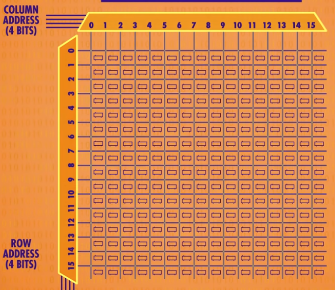 이때, 각 교차점을 정확하게 지정하기 위해서 메모리 주소(Memory Address)가 필요하다. 최대 16개의 행이 있기 때문에, 행 주소를 4비트로 표현한다. 열 주소도 마찬가지다.