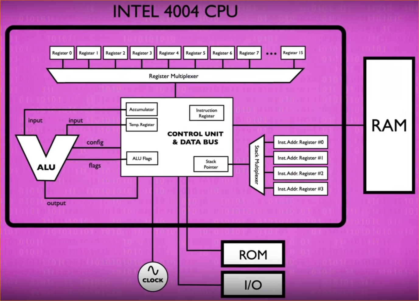 이 CPU는 최초의 프로세서임에도 불구하고, 740kHz로 작동했다. 1초에 74만 사이클이 수행된다는 것이다. 빠르다고 생각할 수도 있지만, 요즘 우리가 사용하는 프로세서와 비교하면 아무것도 아니다. 1메가 헤르츠(MHz)는 1초에 백만 clock 사이클이고, 우리가 사용하는 컴퓨터나 스마트폰은 몇 기가헤르츠(GHz)로 작동한다. 매 1초마다 수십억 개의 CPU 사이클이 작동한다는 뜻이다.