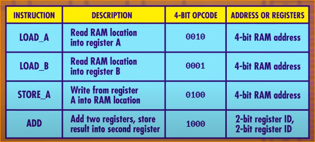 마이크로아키텍처(microarchitecture)라고 하는 상위 수준의 개념으로 접근해보자. 우선 메모리가 필요하다. 간단하게 16개의 저장공간이 있고, 각 저장공간에는 8bit를 저장할 수 있는 RAM이 있다고 가정하자. 그리고 프로세서는 A, B, C, D라고 하는 4개의 8bit 메모리 register를 갖고 있다고 가정하자. 이 레지스터들은 값들을 조작하고 임시로 저장하는 데 사용할 것이다. 알다시피 data는 메모리에 이진수 형태로 저장된다. 프로그램도 역시 메모리에 저장된다.