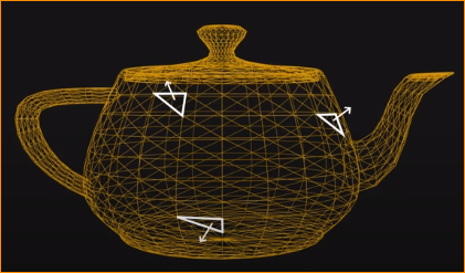 이전에 주전자 메쉬는 이렇게 된다. 3D 같아 보이지 않는다. 현실성을 높이기 위해서는 조명을 추가해야 한다. 예를 들어, 폴리곤의 3곳의 다른 부분을 선택할 것이다. 이전 예와 달리 이제는 이 폴리곤들이 3D 공간에서 어떻게 방향을 잡을지 고려할 것이다. 이 폴리곤들은 더 이상 화면에 평행이 아니고, 다른 3D 방향으로 기울어져 있다. 이 폴리곤들이 마주하는 방향을 표면 법선(Surface Normal)이라고 부르며, 다음과 같이 폴리곤 표면에 수직인 작은 3D 화살표로 방향을 시각화할 수 있다.