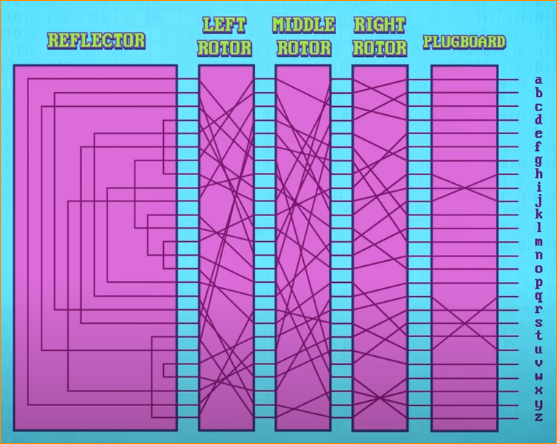 먼저, 하나의 회전자를 가지고 살펴보자. 한쪽에는 26개의 글자를 위한 전기 접점이 있다. 이 접점은 한 글자마다 서로 다른 글자로 바뀌어 엇갈리는 선들을 사용하여 회전자의 다른 쪽에 연결된다. 바로 대체 암호가 사용되는 것이다. 그러나 애니그마는 3개 이상의 회전자를 연속적으로 사용했기 때문에 더 정교해졌고, 각각의 회전자는 연속적으로 사용되었다. 회전자는 26개의 가능한 시작 위치에서 회전할 수 있었고, 서로 다른 순서로 삽입될 수 있었으며, 다른 대체 매핑이 많이 존재했다.